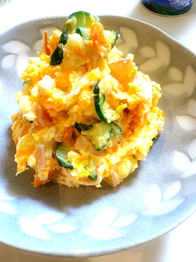 3. 粗熱が取れたら、ハム・きゅうり・マヨネーズ・酢を加えてよく混ぜる。